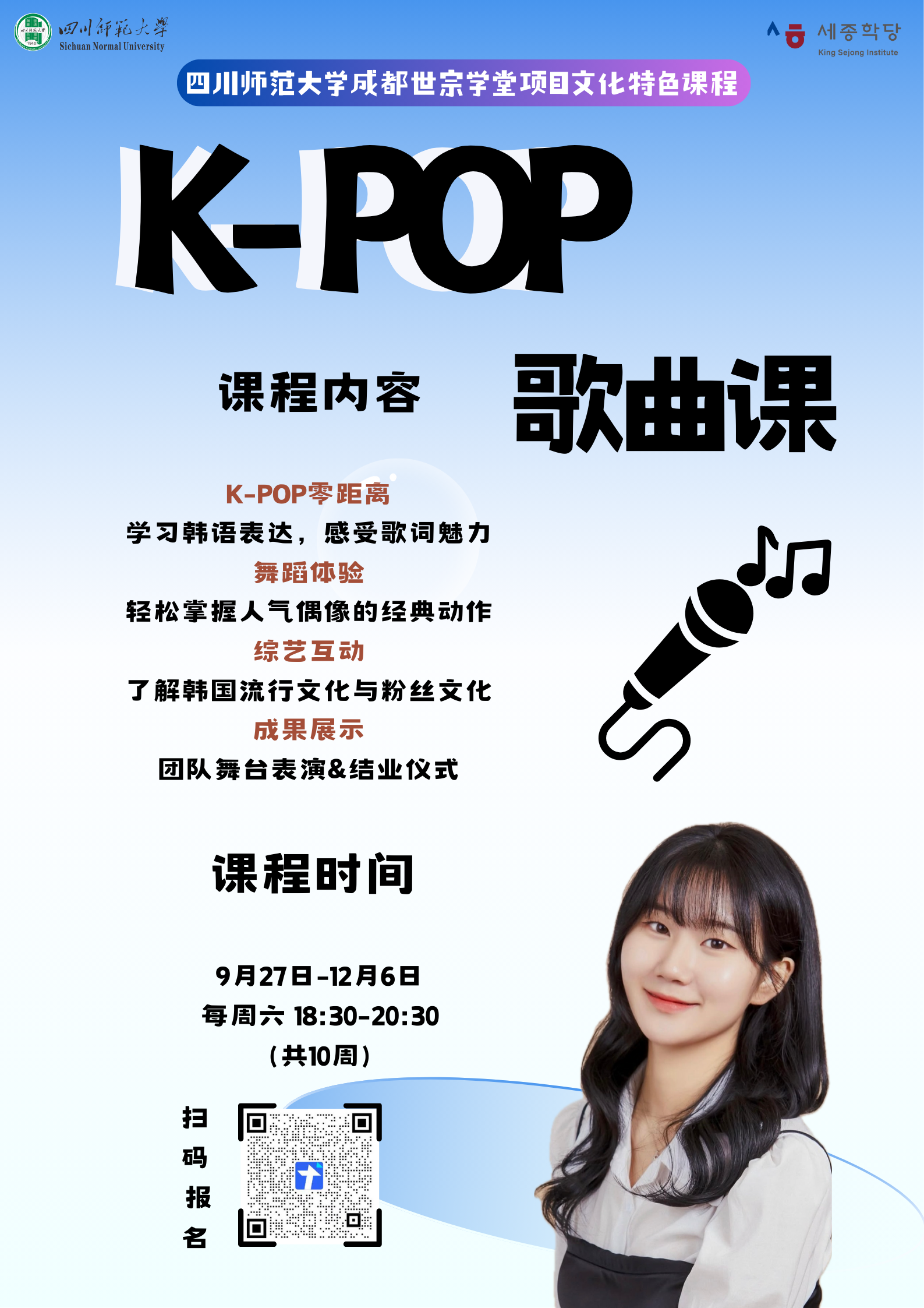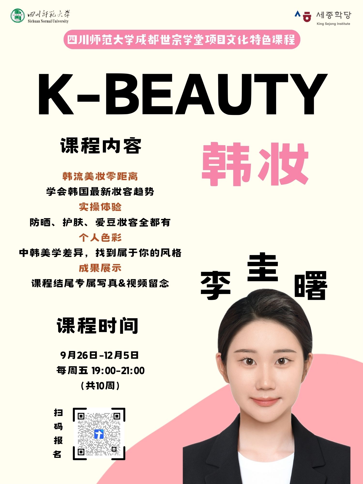 2025年9月26日至27日,四川师范大学世宗学堂项目2025年秋季文化特色课程正式开课。本学期开设“K-Beauty韩妆”与“K-Pop歌曲”两门特色课程,由韩国外教李圭曙老师主讲,为学员构建了一个融合语言学习与潮流魅力的沉浸式体验平台。