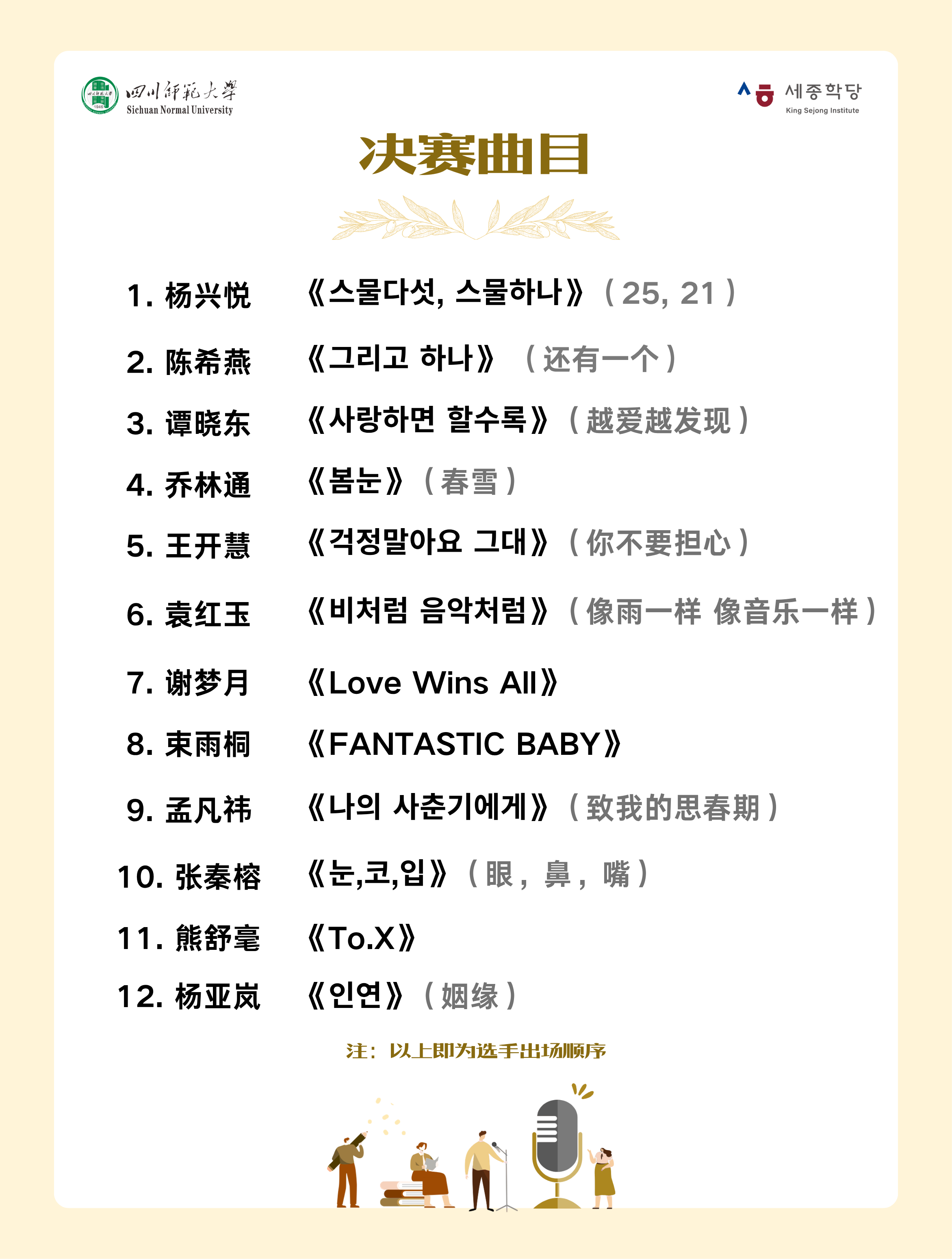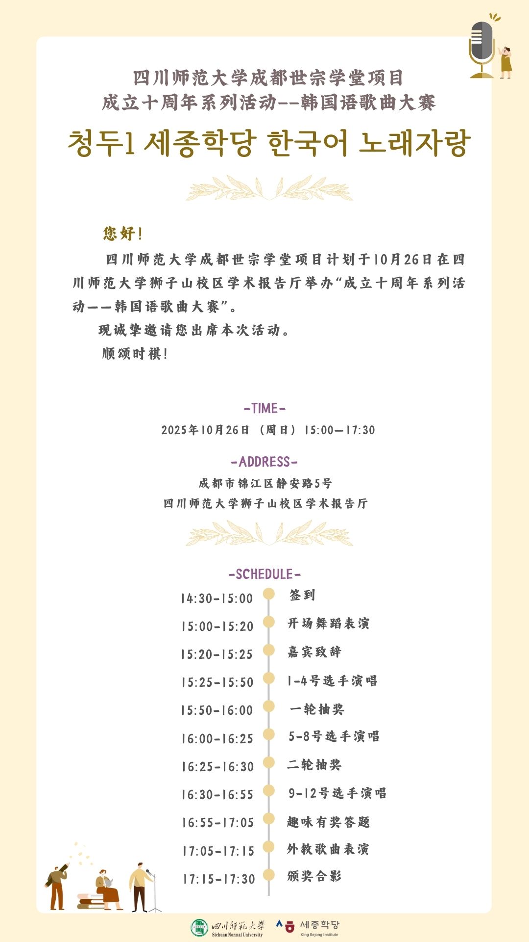 世宗“拾”光,同心筑梦。四川师范大学2025年国际教育交流月系列活动之韩国语歌曲大赛预赛已于10月14日结束。经专业评审,12位选手成功晋级。决赛强音即将唱响,让我们以歌为赞,以声为礼,共庆成都世宗学堂的十岁生日!