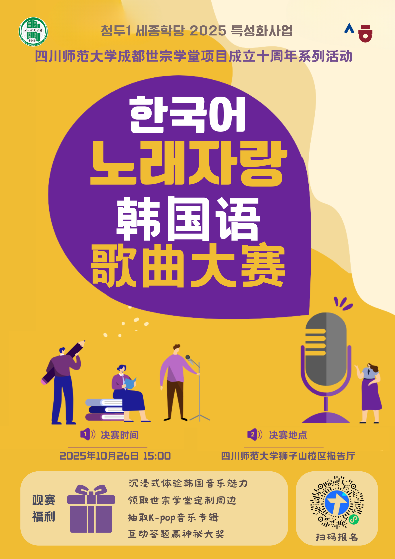 2025年10月26日,四川师范大学2025年国际教育交流月系列活动之韩国语歌曲大赛在狮子山校区学术报告厅顺利举办。出席本次比赛的嘉宾有四川师范大学校党委副书记张海东、国际交流合作处处长郑鸿颖、国际中文教育学院教授兼成都世宗学堂项目运营要员刘海燕、四川旅游学院国际教育学院院长白丹、成都第二世宗学堂运营专员李亚静,以及成都韩字学校韩语教师申贞和等。担任比赛的评委有韩国旅游发展局成都办事处社长金效经、乐盟国际学校中高等部副校长兼韩国文学教师黄仁领、四川传媒学院韩语教师崔红莲、四川师范大学音乐学院教师陈姗、国际中文教育学院教师李晴雁。