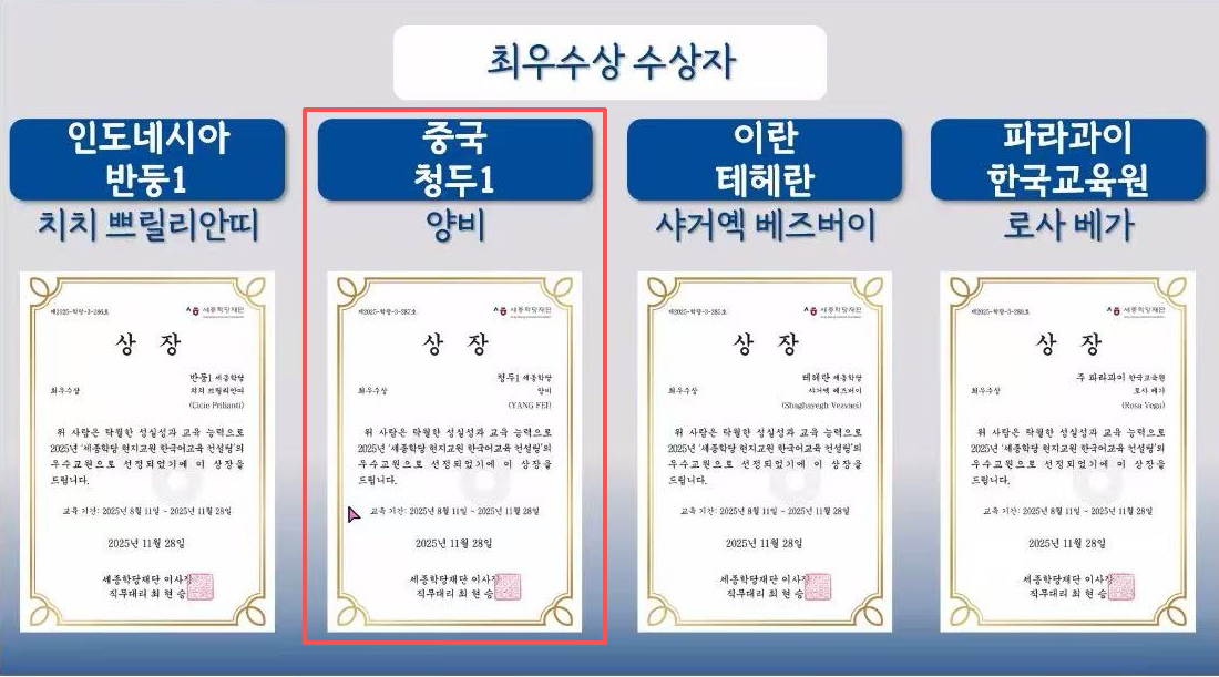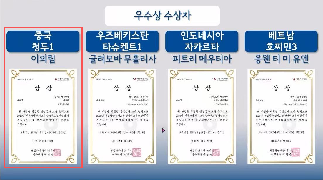 2025年11月29日,世宗学堂总部主办的全球世宗学堂在职教师培训(세종학당 현지교원 컨설팅)结业式顺利举行。四川师范大学成都世宗学堂项目杨霏老师获评“最优秀教师”,李宜霖老师获评“优秀教师”。