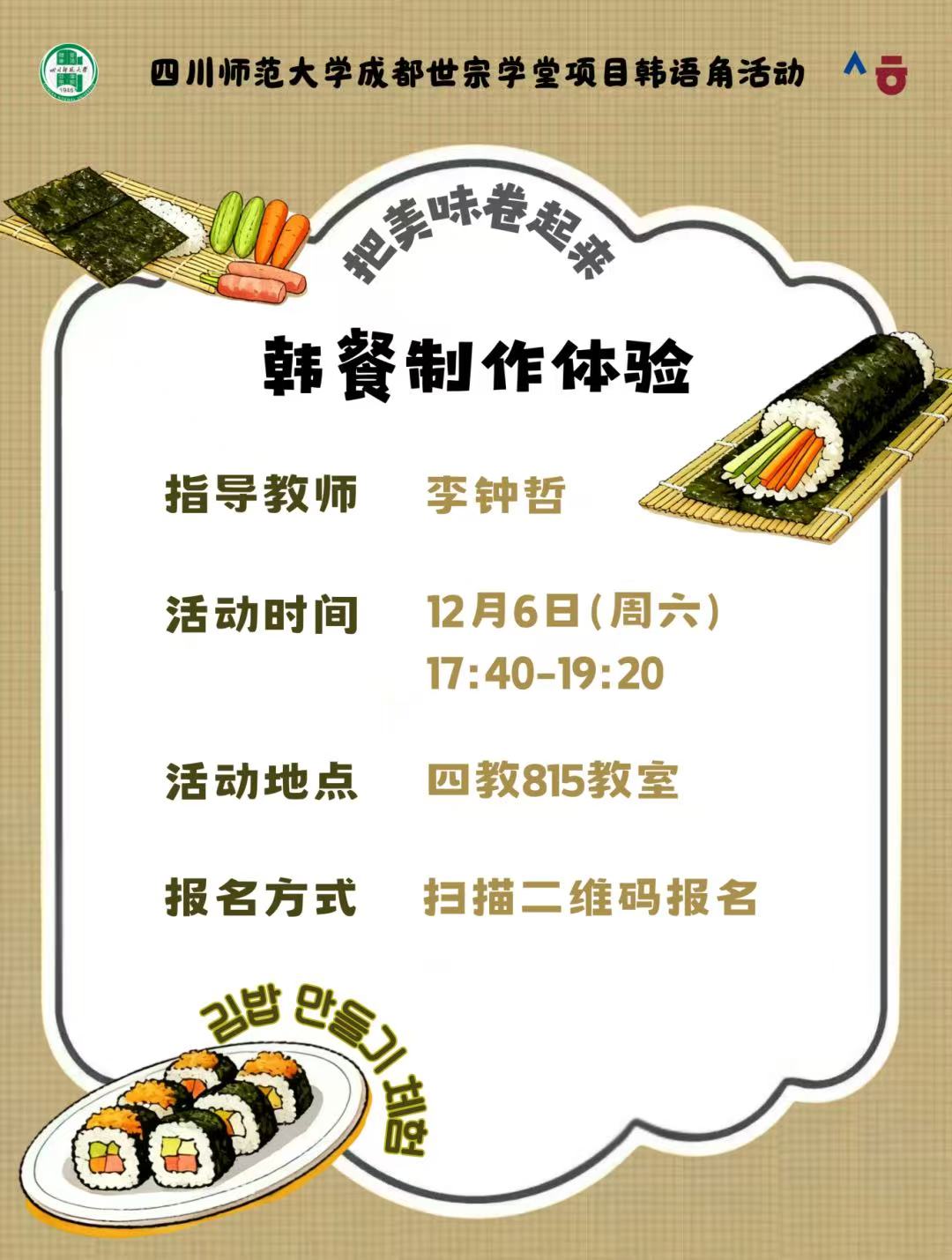 2025年12月6日,四川师范大学成都世宗学堂项目第十四期韩语角活动在狮子山校区第四教学楼815教室顺利开展。本次活动的主题为“韩餐制作体验”,特邀李钟哲老师担任主讲,带领学员们制作韩国日常美食——紫菜包饭,沉浸式感受韩国饮食文化的魅力与乐趣。